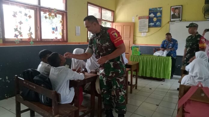 Lumajang, Wujud kepedulian TNI terhadap kesehatan generasi penerus bangsa kembali terlihat di Kecamatan Kunir. Babinsa Desa Jatigono Koramil 0821-13/Kunir, Sertu Tiar Affandi, bersama dua anggota melaksanakan pendampingan petugas dari Puskesmas Kunir pemberian vitamin dan obat cacing kepada 82 siswa SD Negeri Jatigono 02, Kecamatan Kunir, Kabupaten Lumajang, Jawa Timur, pada Senin (3/11/2025).