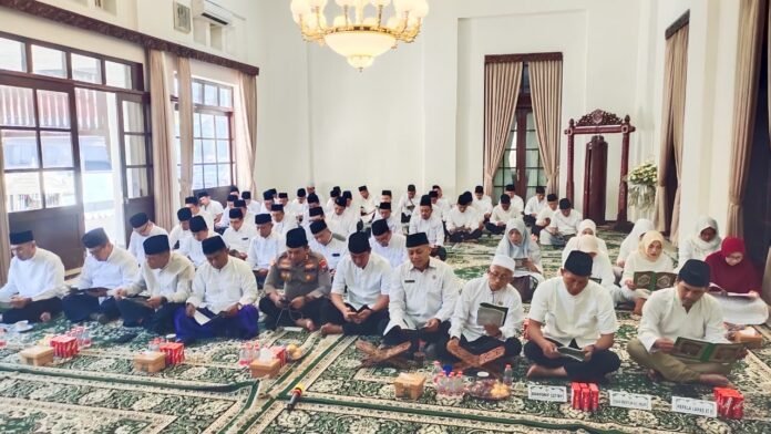 Lumajang — Forkopimda Kabupaten Lumajang kembali melaksanakan Khotmil Quran Jumat Legi 2026, sebuah kegiatan religius rutin yang digelar di Pendopo Arya Wiraraja, Jumat (9/1/2026). Acara yang penuh khidmat ini dihadiri pimpinan daerah, tokoh agama, serta unsur TNI-Polri sebagai bentuk komitmen bersama menjaga ketentraman dan keselamatan masyarakat Lumajang.