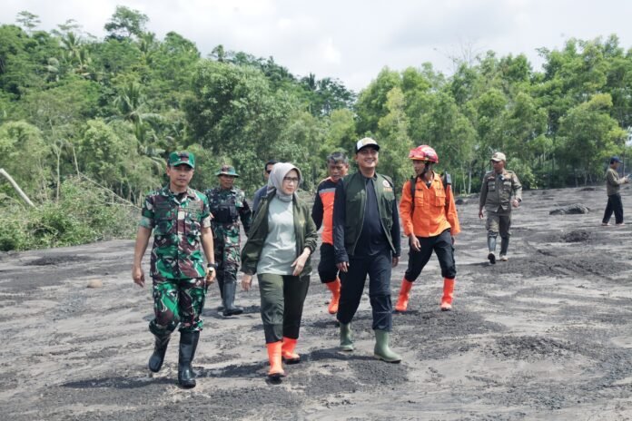 Lumajang — Forkopimda Lumajang melaksanakan peninjauan langsung ke lokasi terdampak banjir lahar dingin Gunung Semeru di Dusun Sumberlangsep, Desa Jugosari, Kecamatan Candipuro, Minggu (7/12/2025). Peninjauan ini dipimpin Bupati Lumajang, Ir. Hj. Indah Amperawati, M.Si, didampingi Wakil Bupati Lumajang serta Dandim 0821/Lumajang, Letkol Arh Anton Subhandi, S.A.P.