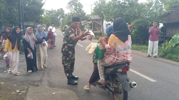 Lumajang – Semangat berbagi di bulan suci Ramadan ditunjukkan oleh Babinsa Sruni Koramil 0821-05/Klakah, Serka Muhammad Nimin, bersama Bhabinkamtibmas Sruni, Aiptu Ari Dwi Handoko dampingi para siswa SDN Sruni 01 menggelar kegiatan pembagian takjil kepada para pengguna jalan yang melintas di jalan Desa Sruni, Kecamatan Klakah, Kabupaten Lumajang, Jawa Timur, pada Minggu (15/3/2026).