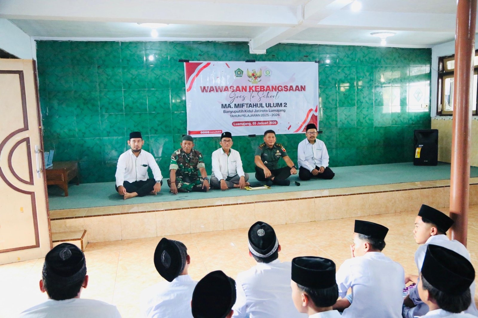 Lumajang — Kasdim 0821/Lumajang, Mayor Inf Tanuri, memberikan pembekalan Wawasan Kebangsaan (Wasbang) kepada santri dan santriwati Pondok Pesantren Miftahul Ulum, Desa Banyuputih Kidul, Kecamatan Jatiroto, Kabupaten Lumajang, Senin (5/1/2026). Kegiatan ini merupakan bagian dari pembinaan teritorial TNI AD dalam rangka menanamkan nilai-nilai nasionalisme dan cinta Tanah Air kepada generasi muda.
