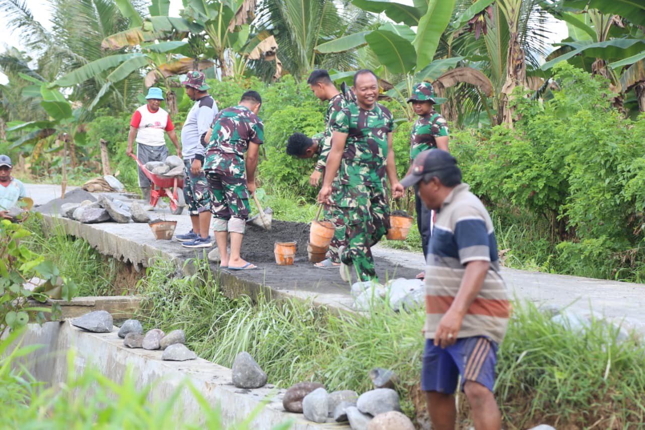 Di tengah udara sejuk dan hamparan hijau persawahan, semangat gotong royong tampak menyatu tanpa sekat. Tidak ada jarak antara prajurit dan masyarakat—semuanya bekerja dalam satu tujuan: menghadirkan infrastruktur yang bermanfaat dan tahan lama bagi warga desa.