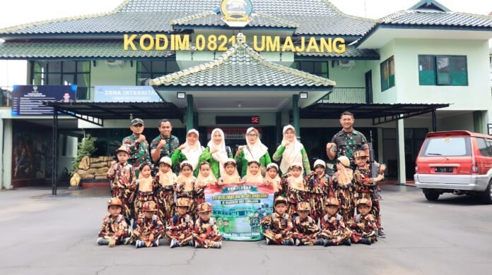 Lumajang — Kodim 0821/Lumajang menerima kunjungan Outing Class dari RA Muslimat NU 02 Selokbesuki, Kecamatan Sukodono, di Makodim 0821/Lumajang, Rabu (14/1/2026). Kegiatan edukatif ini diikuti puluhan siswa dan pendamping guru sebagai upaya memberikan pengalaman belajar langsung mengenai kedisiplinan, wawasan kebangsaan, serta pengenalan lingkungan TNI.