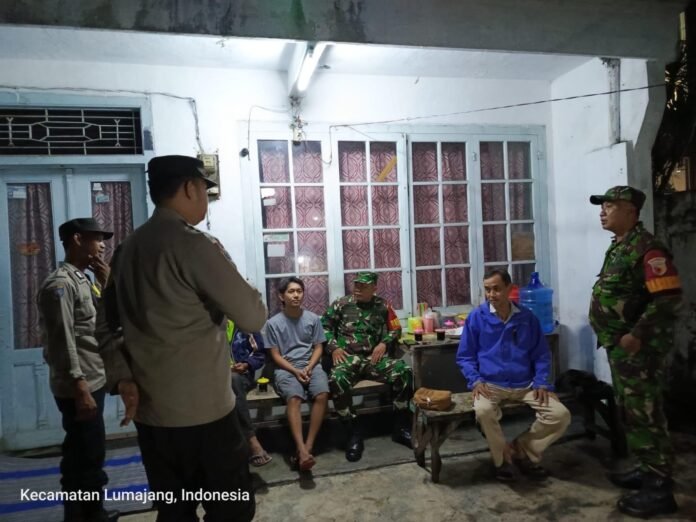Lumajang, Guna menjaga stabilitas keamanan dan ketertiban masyarakat (kamtibmas), Babinsa Banjarwaru Koramil 0821-01/Lumajang, Serda Syamsudin, bersama unsur Tiga Pilar Banjarwaru melaksanakan patroli gabungan di wilayah Dusun Krajan RT 001 RW 002, Desa Banjarwaru, Kecamatan Lumajang, Kabupaten Lumajang, Jawa Timur, pada Jumat malam (19/12/2025).
