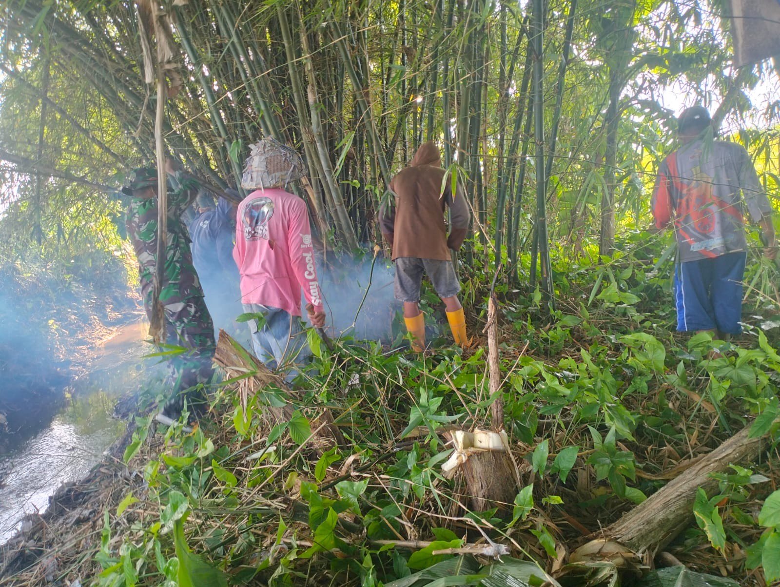 Proses pembersihan dilakukan secara gotong royong oleh anggota Hippa, warga sekitar, dan Babinsa. Rumpun bambu yang sebelumnya mempersempit saluran dipotong, dibersihkan, dan diangkut keluar jalur irigasi agar tidak mengganggu aliran air.