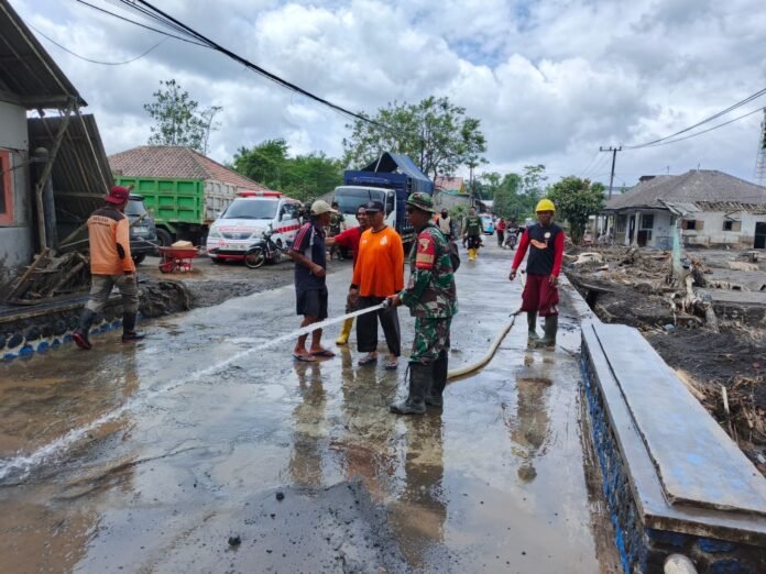 Lumajang — Upaya pemulihan pascabencana di wilayah terdampak terus dilakukan secara intensif. Dalam aksi gotong royong yang berlangsung pada Senin (1/12/2025), personel TNI bersama relawan dan warga bahu-membahu membersihkan jalan utama yang sebelumnya tertutup lumpur tebal akibat banjir lahar dingin. Kegiatan tersebut dipimpin oleh tertua di lapangan, Pelda Said, yang memastikan seluruh proses berjalan aman, cepat, dan terkoordinasi.