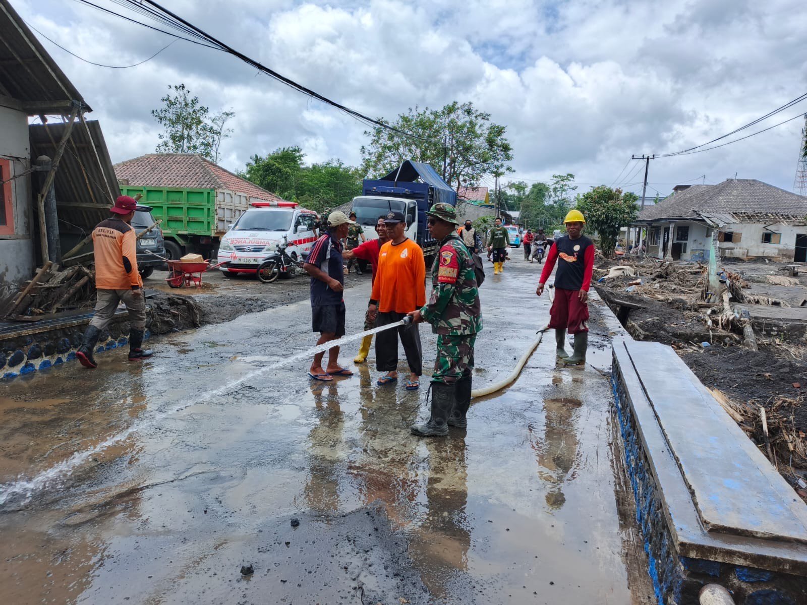 Terlihat personel TNI, relawan berseragam oranye, serta warga setempat bekerja membersihkan jalan dengan semprotan air bertekanan. Mereka menyingkirkan lumpur dan material yang menghambat akses warga maupun kendaraan logistik. Tampak pula ambulans, truk angkut, dan alat bantu lainnya yang disiapkan untuk menunjang percepatan penanganan.