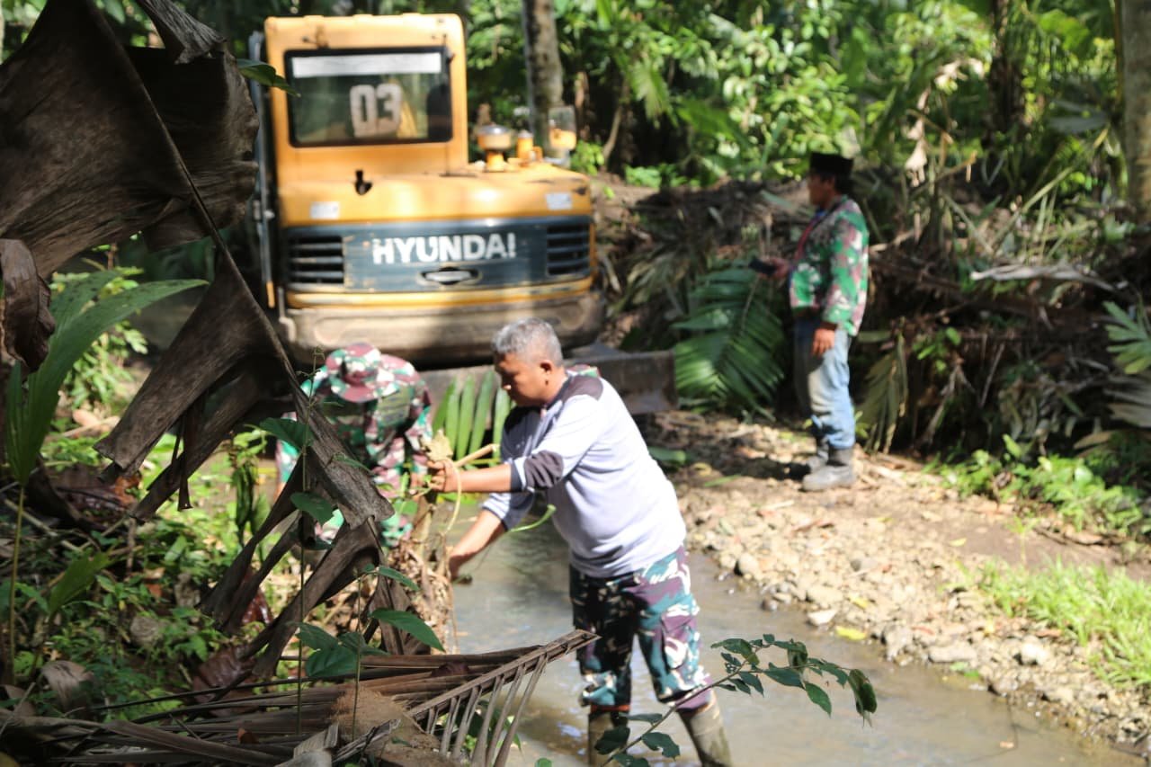 Satgas TMMD bersama masyarakat setempat bergotong royong melakukan normalisasi sungai untuk memperlancar aliran air dan mencegah terjadinya banjir saat musim penghujan. Proses pengerjaan dilakukan dengan memanfaatkan alat berat ekskavator untuk pengerukan tanah, serta alat manual seperti sabit untuk membersihkan ranting, daun, dan semak yang menghalangi jalur air.