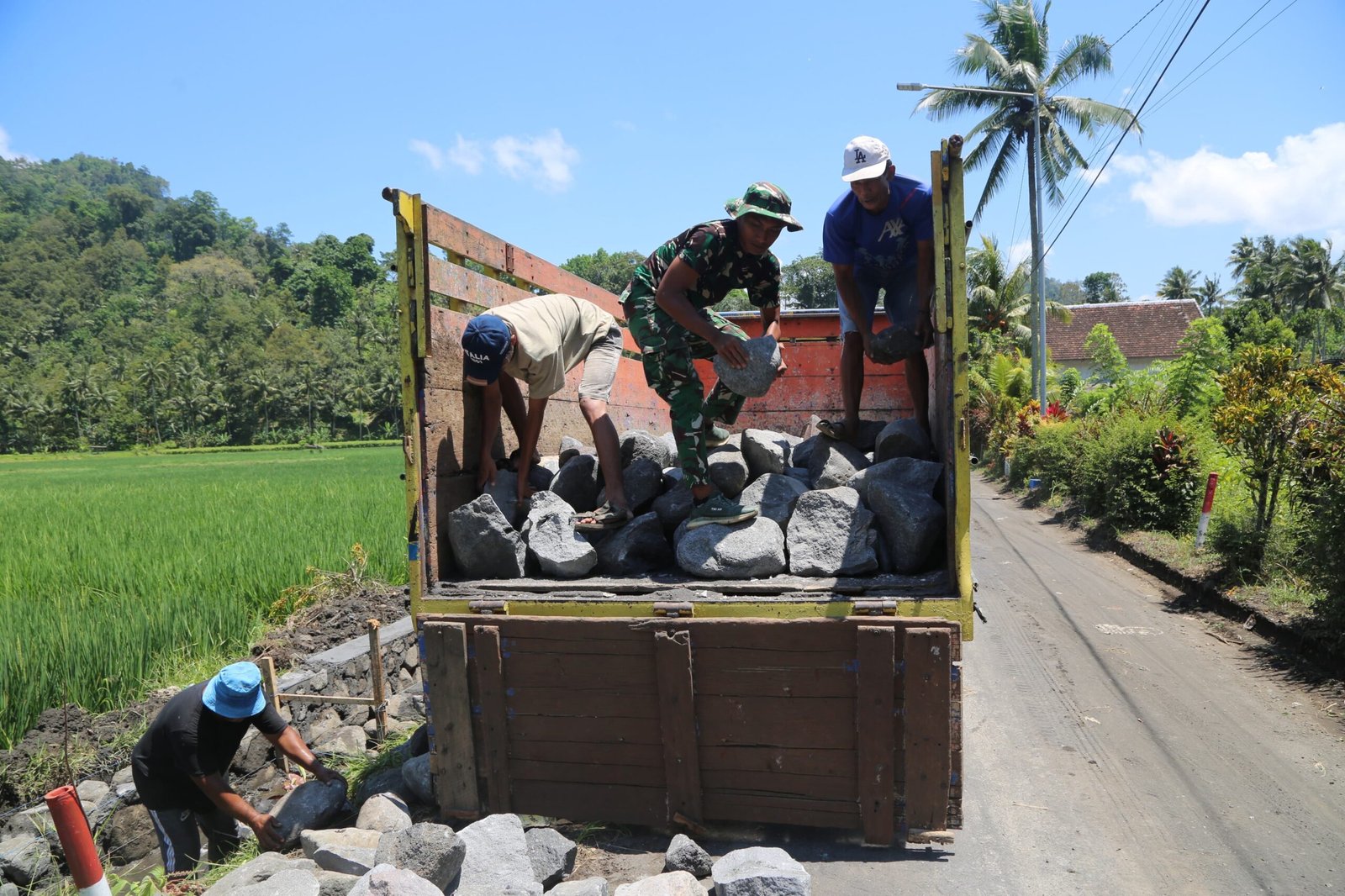 Semangat Kebersamaan, Personel TMMD Kodim 0818 Turunkan Material Batu untuk Dukung Pembangunan Desa Lebakharjo