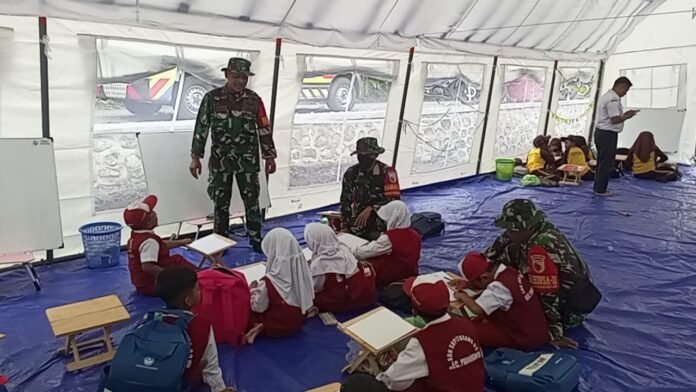 Lumajang – Upaya menjaga keberlangsungan pendidikan bagi anak-anak terdampak erupsi Gunung Semeru terus menjadi perhatian Kodim 0821/Lumajang. Dua personel, Sertu Karminto dan Serda David Mardianto, melaksanakan pendampingan sekaligus pengamanan (PAM) pada kegiatan belajar mengajar di sekolah darurat SDN 02 Supiturang, yang kini bertempat di halaman rumah warga milik Pak Gunawan di Desa Sumbersari, Kecamatan Pronojiwo. Selasa(2/12/2025)