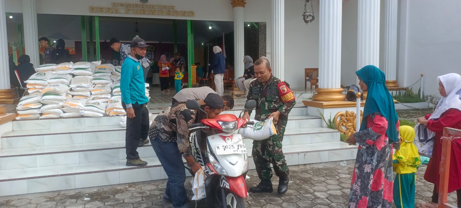 Lumajang, Dalam rangka mendukung ketahanan pangan dan meringankan beban masyarakat, Babinsa Purwosono Koramil 0821-19/Sumbersuko, Serka Masrohim Atmajaya Putra, melaksanakan pendampingan kegiatan penyaluran bantuan pangan berupa beras kepada warga di Balai Desa Purwosono, Kecamatan Sumbersuko, Kabupaten Lumajang, Jawa Timur. Senin (4/8/2025).